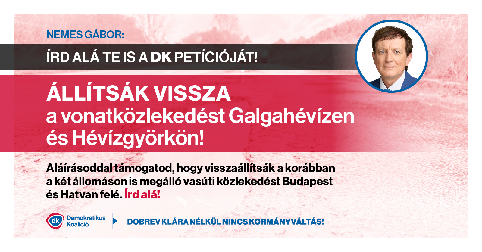A Demokratikus Koalíció a Galga mentén élők visszajelzése alapján aláírásgyűjtést kezdeményez, hogy a korábbiakban megszokott vonatközlekedést, annak elérhetőségét biztosítsa a Galgahévíz és Hévízgyörkön élők számára és állítsák vissza az ütemes vasúti közlekedést Galgahévíz és Hévízgyörk vasútállomáson.