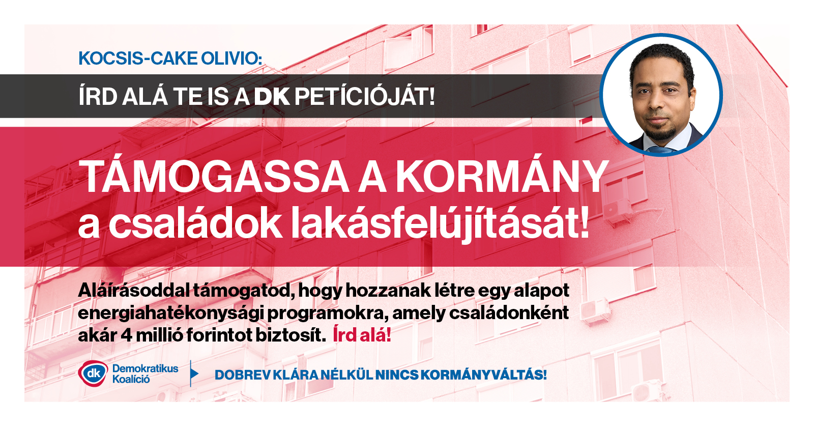 Úgy gondoljuk, hogy az államnak kötelessége szerepet vállalnia abban, hogy a családok korszerűsíthessék otthonaikat, legyen szó energiahatékonysági megoldások alkalmazásáról, fűtésmodernizációról, nyílászárók cseréjéről. Erre a Demokratikus Koalíció családonként akár 4 millió forint vissza nem térítendő támogatás bevezetését javasolja, melyet aláírásoddal te is támogathatsz!