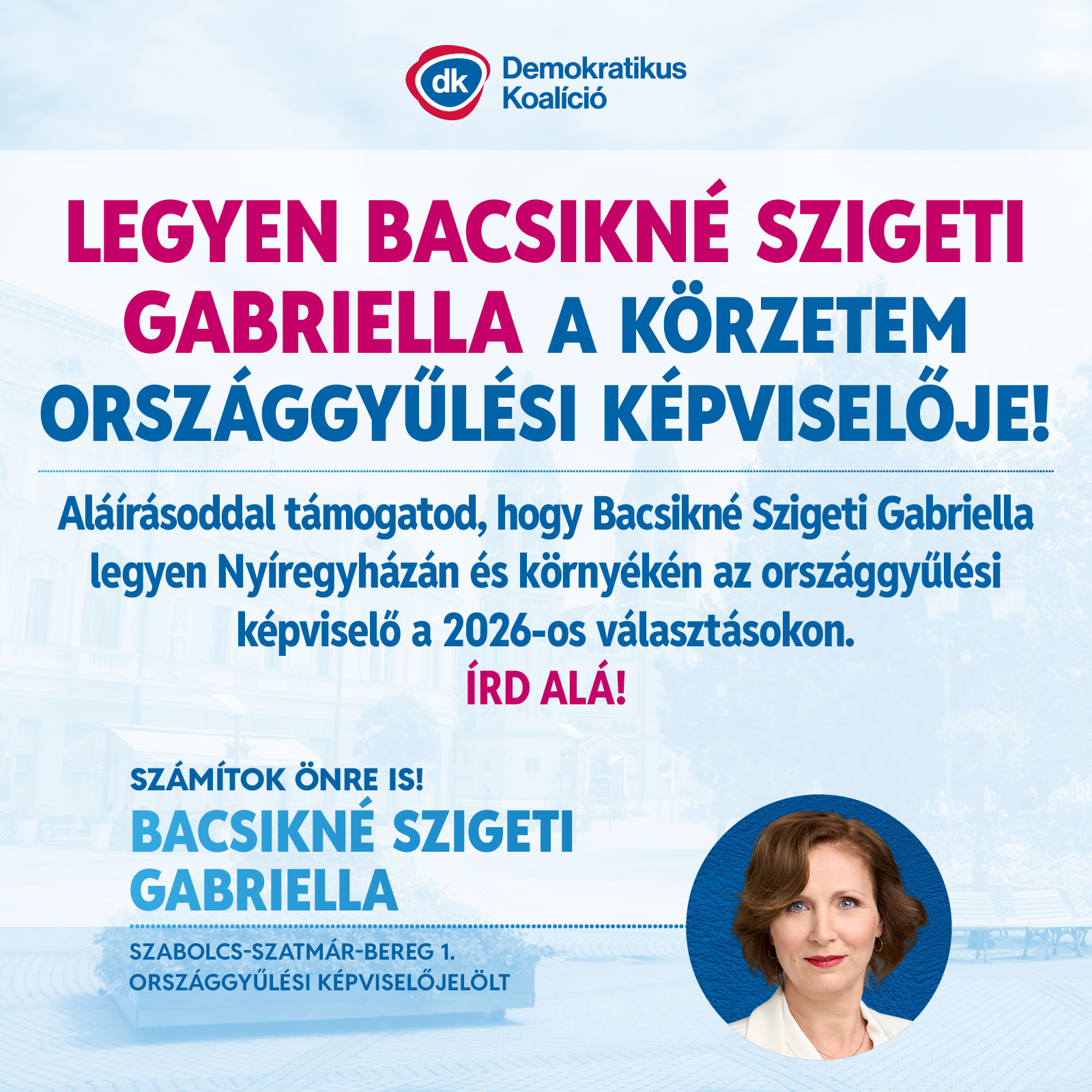Aláírásoddal támogatod, hogy Bacsikné Szigeti Gabriella legyen választókörzeted országgyűlési képviselője a 2026-os választásokon! ÍRD ALÁ!